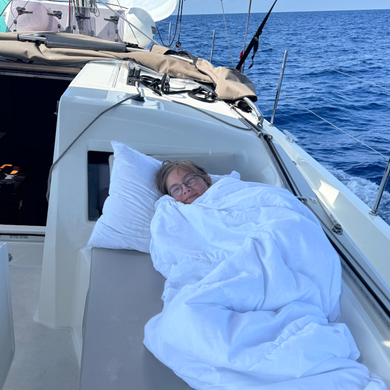 Insgesamt gibt es 5 Kabinen (4 Doppelkabinen, 1 Stockbettkabine) mit jeweils 2 Schlafplätzen an Bord – insgesamt haben also 10 Personen Platz (8 Jugendliche + Skipper & Betreuerin). Die Aufteilung wird gemeinsam besprochen und entschieden. Bisher hat das immer super geklappt. Und bei gutem Wetter kann man auch super an Deck auf Polstern oder in der Hängematte schlafen!